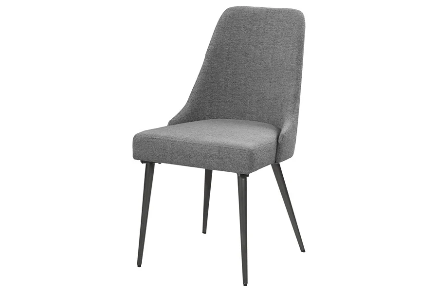 Inspire a modern motif with the clean lines and retro-like feel of this armless dining chair. Mid-century modern design gets a contemporary makeover with sleek monochrome hues. Thin, tapered legs in a gunmetal grey finish add a sophisticated and open feel. Grey textured fabric covers the back and seat cushions, with a wingback-like silhouette. Charming details and design create a clean piece that looks great around small and large tables.