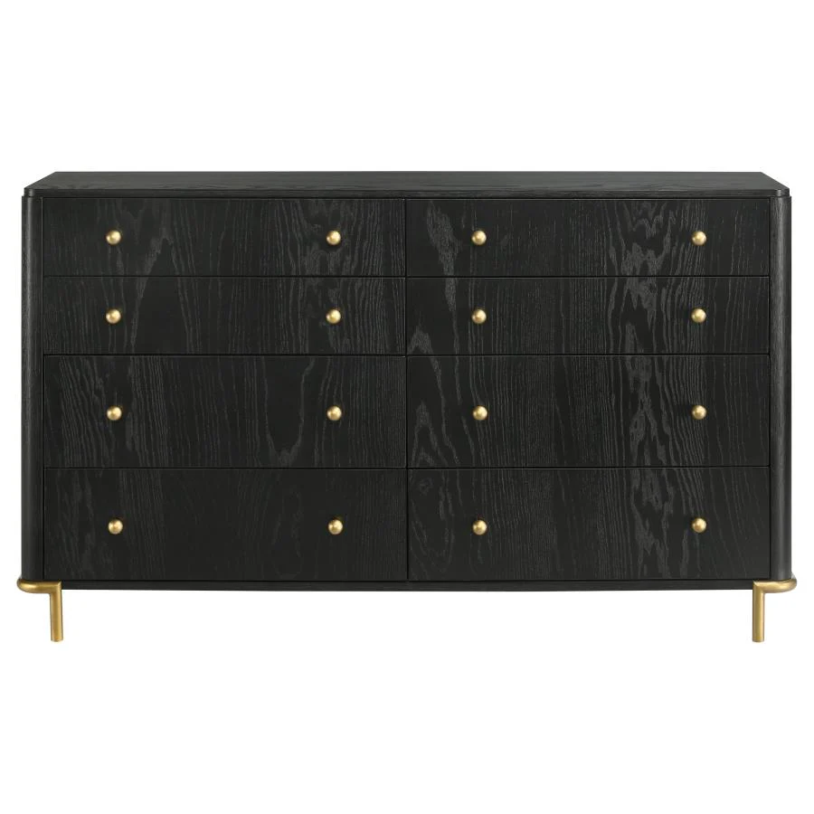 Graceful lines are enhanced with the wire brushed finish and wood grain details of a modern dresser. Eight drawers create ample storage and organization for clothing and linens, helping to keep your bedroom tidy and organized. Top drawers are lined with felt to offer protection for delicates and other precious items. Each drawer features English dovetail joinery and is complemented with a pair of round ball knobs in a muted gold finish that perfectly matches the legs of the piece. Use the wide top for decor to create a vanity space perfect for morning beauty rituals.