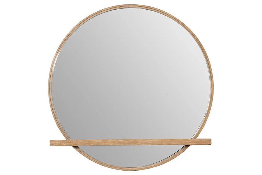 Make the most of your dresser space with this elegant, modern, dresser mirror, designed with a clever built-in tray below and a spacious round mirror above to help you prepare for the day. A wire-brushed sand wash wood frame presents an earthy light tone hue. The felt-lined tray secures jewelry and essentials, keeping a clutter-free dresser surface for restful bedroom retreats.