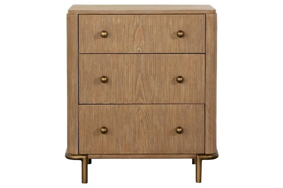 Retro-inspired elements come together in this mid-century modern, three-drawer nightstand, designed with a wire-brushed, sand wash finish and adorned with aged brass round knobs and slender metal tube legs. Extra thoughtful details such as a built-in dual USB port and a felt-lined top drawer make this elegantly shaped nightstand a perfect addition to contemporary and transitional bedrooms and guest rooms.